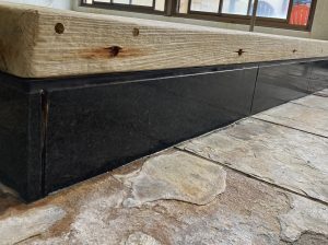 常に高温多湿の浴室は、カビが生えやすい環境です。木製の天板にカビが発生し、黒ずみとなっていました。また、浴槽からあふれるお湯の成分により、御影石の立ち上がりには雨だれのようにスケール汚れが固着していました。